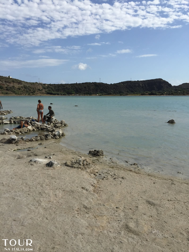 —> na parte sul do lago há uma área delimitada com pequenas pedras que sinaliza a área de lama com propriedades benéficas, com cor cinza-esverdeado porque possui ainda um depósito de algas termófilas, com uso terapêutico contra artrose, e dores musculares, mas sobretudo usada como peeling para a pele.