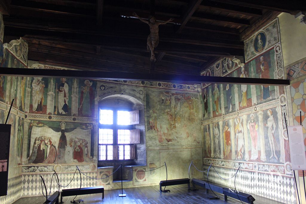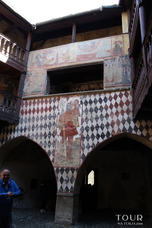 - Castello de Issogne: Possuído pelo Bispo de Aosta até 1379, o Castelo de Issogne foi renovado e ampliado em torno a 1400 por Ibleto de Challant. Sua aparência atual foi modificada por George de Challant, que o transformou em uma residência de luxo. Depois de ter vários outros proprietários, foi comprado pelo artista Vittorio Avondo e renovado em 1872, ano que doou ao Estado. Ele é aberto a visitação e há muito para ver no castelo em si também, incluindo o Salão do Barão adornado de afrescos, a Capela com abóbadas finamente decorados, o “O quarto do rei da França”, onde o teto é coberto lillies, e o quarto “Cavalheiros de São Maurice” com cruz da Ordem pintado nele.