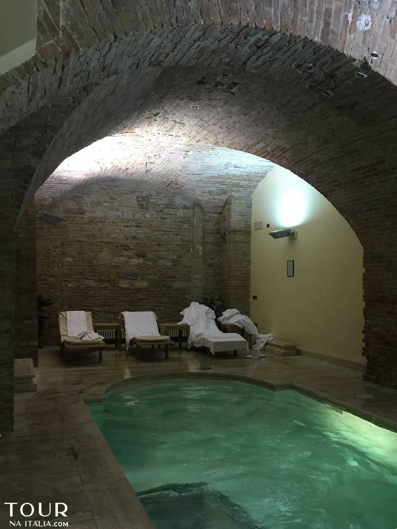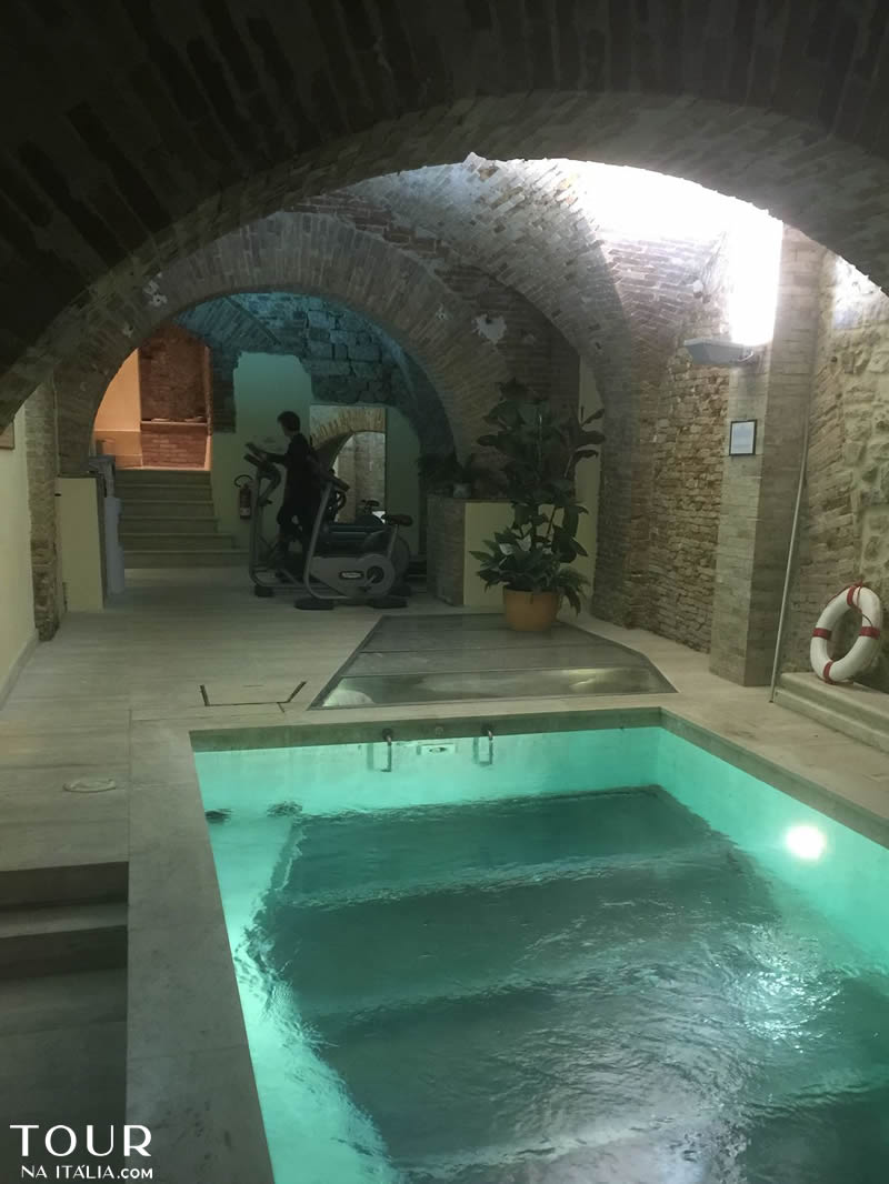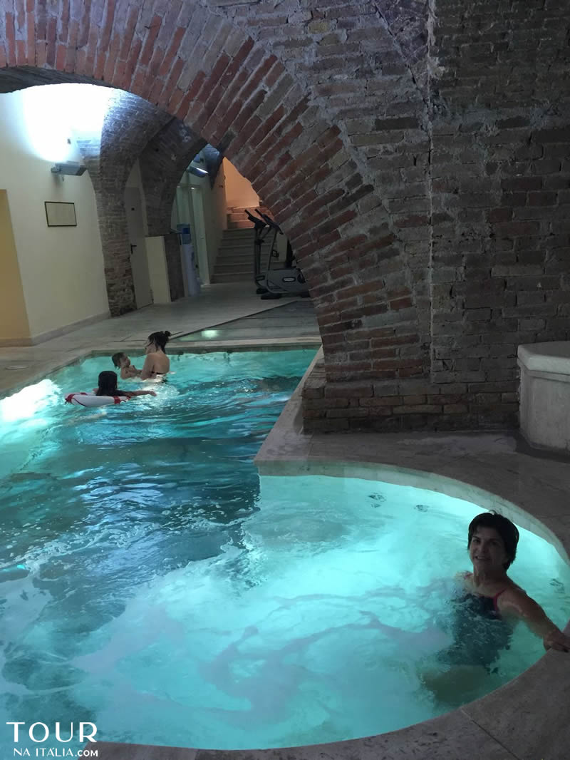 A piscina é incrível porque no fundo é possível ver os restos etruscos, é água é quente e ha áreas com hidromassagem, espreguiçadeiras, sauna, equipamentos de ginástica e área de massagem.