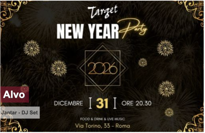 Target Via Torino, 33 – Roma- Faça um brinde a 2026em um dos locais mais ecléticos do centro de Roma: o Restaurante Target. Este restaurante e clube multifuncional, conhecido por sua atmosfera moderna e sofisticada, é o cenário perfeito para uma celebração exclusiva de Ano Novo. A filosofia do local é clara: combinar sabor e música. Para a véspera de Ano Novo, oferece um jantar completo que inclui opções vegetarianas, sobremesas natalinas, vinhos e espumante para a contagem regressiva. O entretenimento será de primeira classe, com música selecionada pelo DJ Lorenzo Nuti . Extremamente fácil de chegar (próximo à Estação Termini), o Target é a escolha perfeita para quem busca uma noite dinâmica e refinada para começar o ano novo com o pé direito. PISO SUPERIOR com entretenimento ao vivo. PISO INFERIOR com o mesmo cardápio e ambiente, sempre com som amplificado e a MESMA música do piso superior.- Reserve conosco