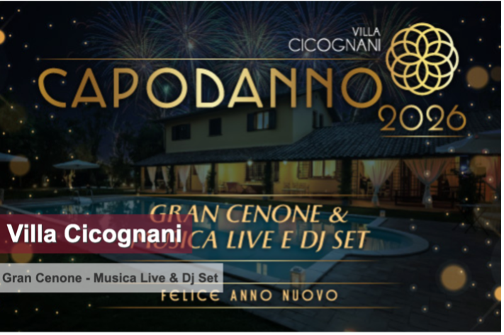 Villa Cicognani  Via Carlo Albizzati, 19 – Roma -Dê adeus ao ano velho e boas-vindas a 2026na Villa Cicognani! Um local de sonho, uma residência histórica rodeada de verde, espera por você para uma noite inesquecível. Localizada a poucos minutos do Raccordo Anulare, entre Roma e Óstia, a villa combina a elegância de um oásis exclusivo com conforto. O Jantar de Gala será servido no salão principal, um ambiente único, com o aconchego das vigas de madeira e uma majestosa lareira de pedra do século XVI . Você poderá escolher entre um menu refinado de carnes ou peixes , enquanto os pequenos desfrutarão de um menu especialmente criado para eles. A noite será animada por música ao vivo elegante e, após a meia-noite, um DJ set vibrante. O jantar começa às 20h30 e termina às 3h da manhã.- Reserve conosco