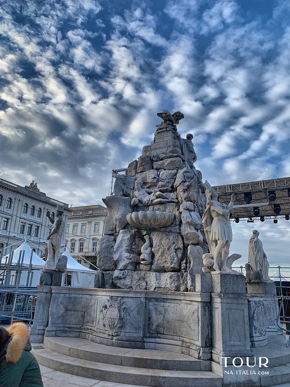 Piazza Unità d’Italia está cheia de testemunhos do passado de Trieste, como a Fonte dos Quatro Continentes (Fontana dei Quattro Continenti), obra feita no século XVIII para celebrar o papel do “porto livre” que a cidade adquirira. A importância de Trieste como uma encruzilhada da Europa e do Mediterrâneo é representada pelas estátuas dos continentes e pelas alegorias dos rios, que derramam água de seus odres.