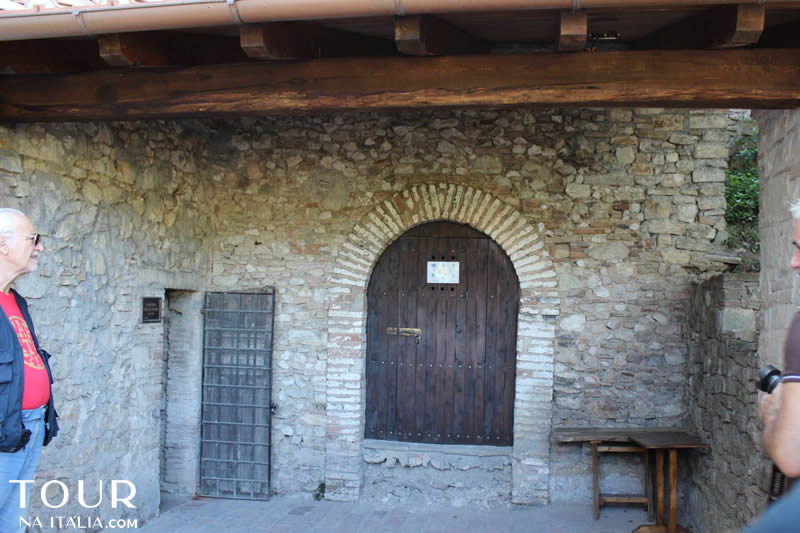 Subimos até o castelo, passando pelas vielas medievais até chegar à pequena Igreja de S.Giovanni Battista, que possui afrescos de 1483 e 1486, onde em muitos deles é representado São Sebastião em seu martírio. Fiquei fascinada por uma escultura de madeira que representava São João Batista, bem intrigante.