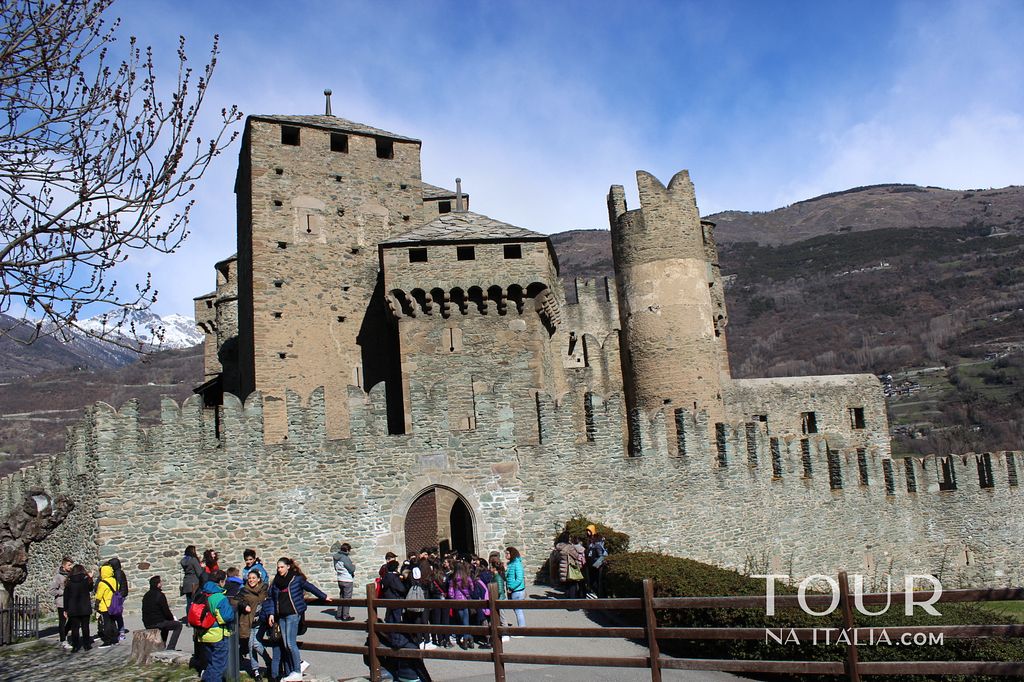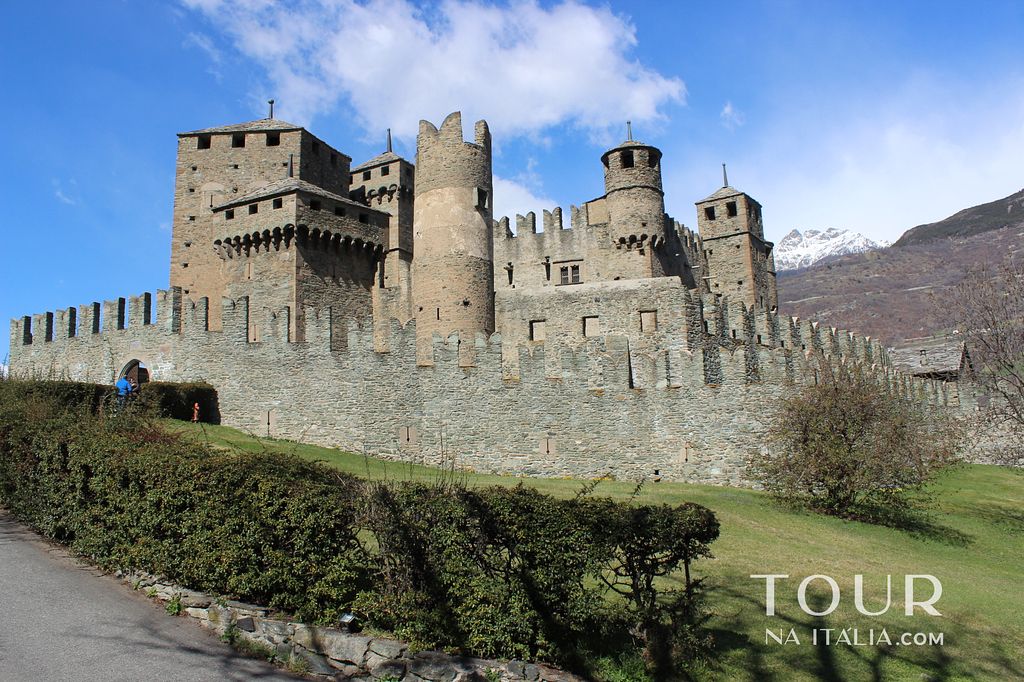 - Castello de Fénis: é famoso por sua arquitetura extraordinária e pelo poder evocativo das suas torres e muralhas. Esta, estrutura harmoniosa e complexa, que é organizada de uma forma concêntrica em torno de um pátio interno, lembra a imagem quase de um conto de fadas. As torres do castelo foram adicionados em meados do século 14 por Aimone de Challant. A propriedade foi então detida pelos Senhores do Challant até 1716, antes de eventualmente ser transformada em uma casa de campo, comprada em 1895 por Alfredo de Andrade. O Casstelo Fénis é aberto a visitas, possui um pátio interior decorado com afrescos incríveis. No térreo há uma sala de armas e de jantar, e uma capela no primeiro andar.