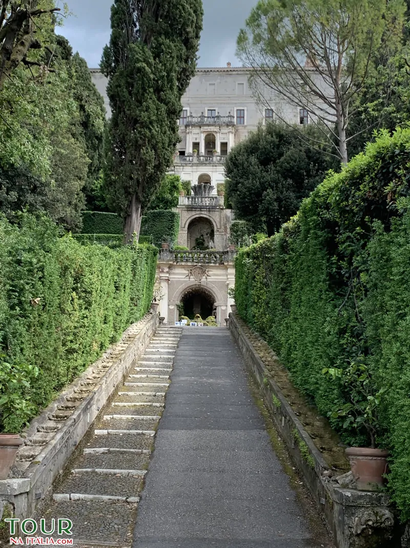 A vila consiste em uma área de mais de 4 hectares, com um grande palácio ladeado por um imenso e belo jardim em estilo renascentista tardio, cheio de fontes espalhadas, alimentadas graças à engenharia hidráulica romana.