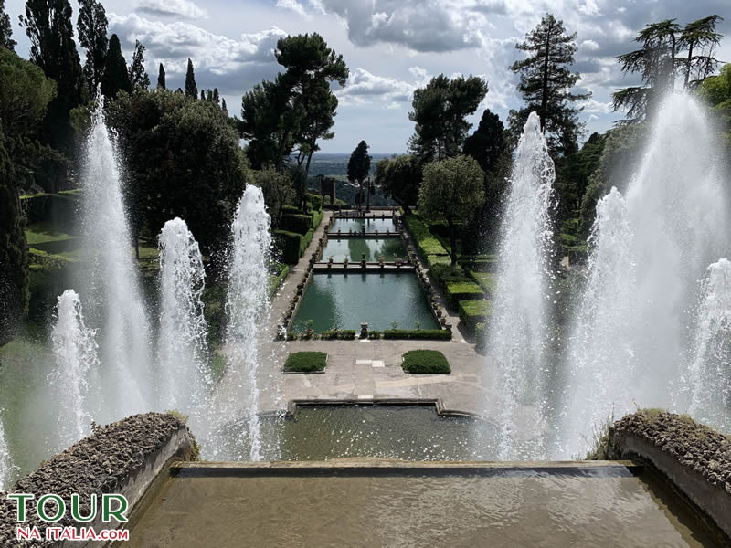 O jardim foi organizado a partir de um eixo central cruzado por eixos secundários, cada qual com características variadas, e entrecortados por inúmeras fontes, lagos e canais, que são alimentados por grandes cisternas cuja água é proveniente do rio Aniene, que passa próximo à cidade. As principais fontes são as seguintes: