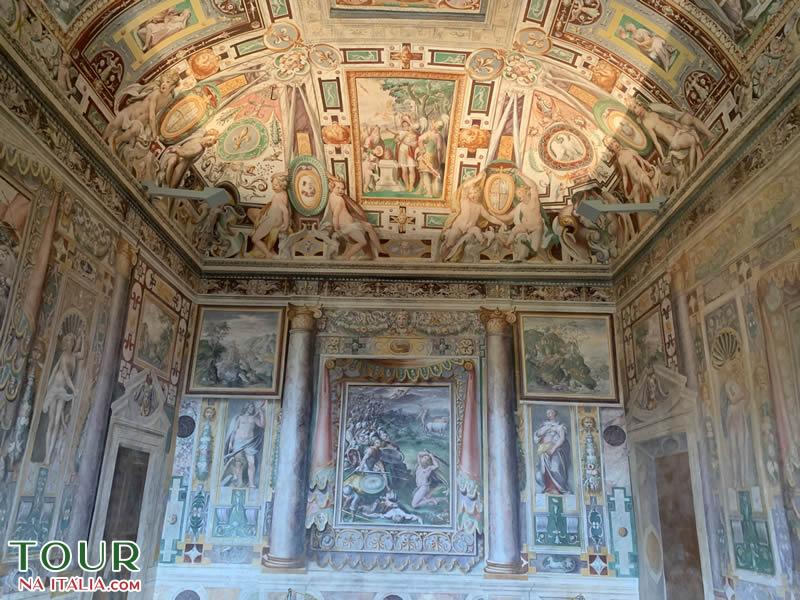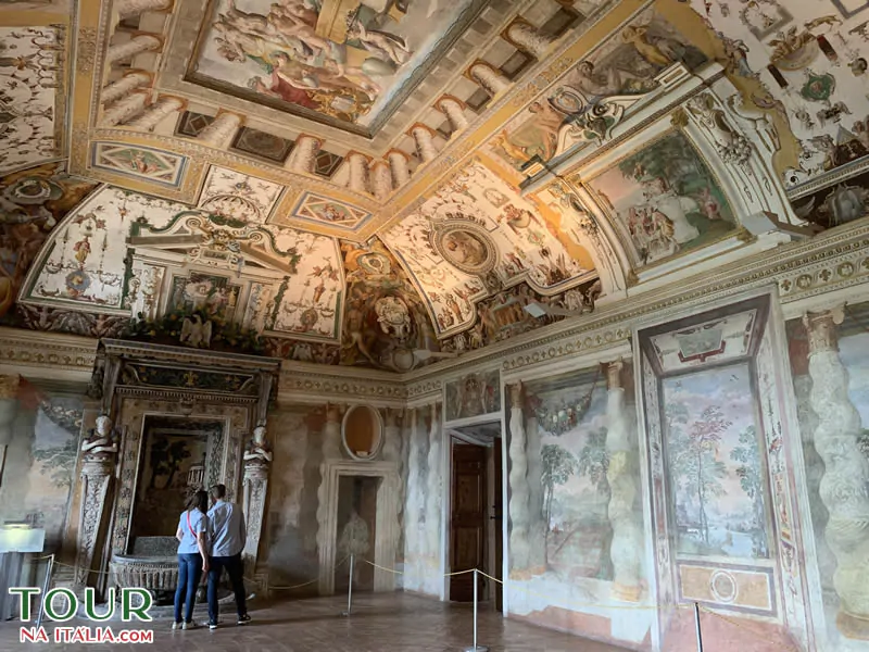 A visita começa pelo palácio, repleto de lindos afrescos que cobrem boa parte do teto e das paredes das várias salas abertas para visitação. Saindo do palácio, tem-se uma linda vista de todo o jardim, localizado em um nível mais baixo do que o edifício principal e acessado por duas escadas laterais.